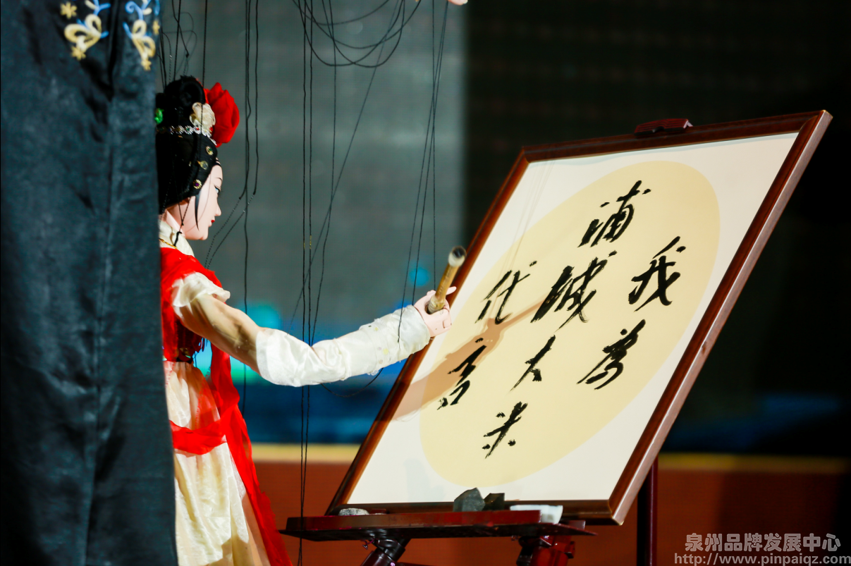 会上,泉州市木偶戏传承保护中心二级演奏员庄丽娥带来的木偶书法艺术表演,让人耳目一新,当小木偶写下“我为浦城大米代言”书法作品,将会场氛围掀到高潮。