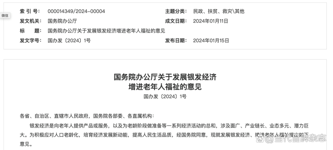 案例1、国务院办公厅印发《关于发展银发经济增进老年人福祉的意见》