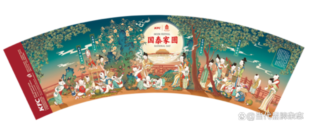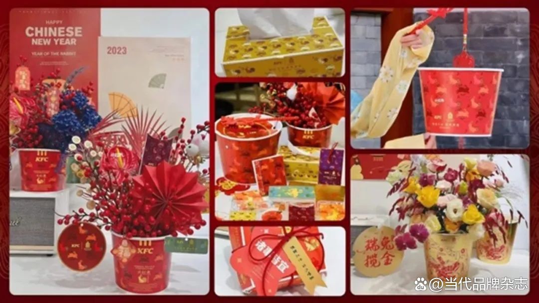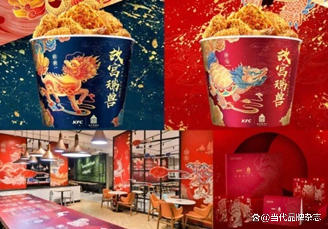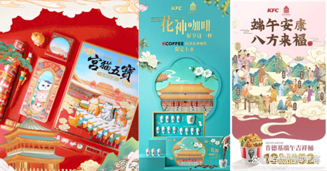 2020年春节,肯德基推出灵感来自中国古代瑞兽的“瑞兽桶”、故宫瑞兽主题店、新春礼盒。到国庆节,推出灵感来自故宫藏品《中秋佳瑞图》的“十一欢庆桶“,结合不同故宫文物系列、发布“宫”迎好运笺。在2021年开年搞了个“宫猫五宝”文创礼盒;紧接着,在春天又推出了灵感源自《五彩十二月花卉纹杯》的“花神咖啡”;23年1月,取故宫典藏文物中的锦绣国色搭配传统纹样,肯德基再次上新春节联名包装;端午,配合端午八风俗的海报,上新“端午吉祥桶”。