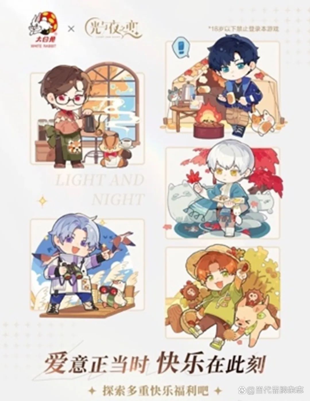 大白兔与国产乙女游戏光与夜之恋开启联动,联动产品为印有 5 位男主首发形象的联名款巨白兔糖型礼盒,购买礼盒的玩家即可获赠对应男主的男主海报一张,产品还将同步线下联华超市全国 175 家指定门店将甜蜜之旅延续至现实。不仅如此,当天所有玩家在游戏内输入暗号「快乐分享大白兔」,即可获得限定联动款头像款和家居摆设,此次活动微博也获得多个国货品牌接力转发,共享甜蜜时刻。