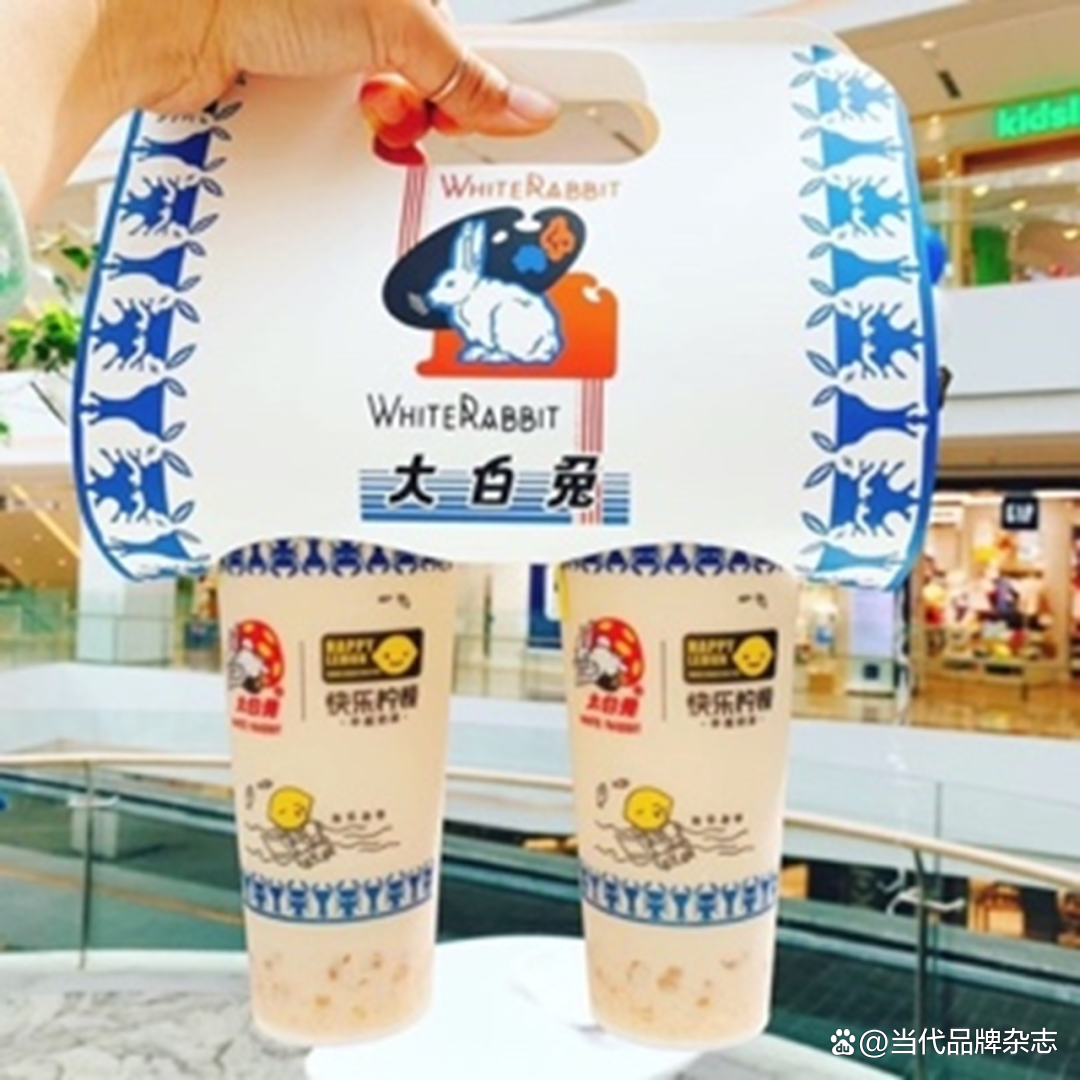 可口可乐X 大白兔联名推出兔年限定包装,并以“兔个乐盒”为宣传语,巧妙融入生肖元素和联名对象。大白兔与快乐柠檬联合在上海开了一家大白兔奶糖造型的快闪奶茶店,门店还推出“大白兔爱柠檬冰淇淋”,排队程度火爆。