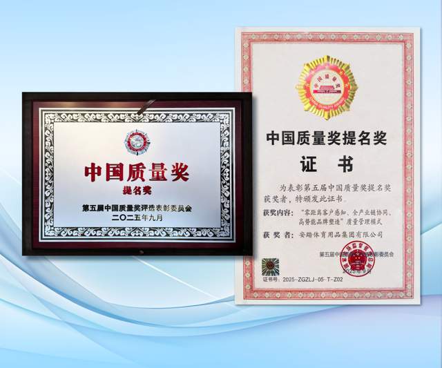 2025年9月16日,第五届中国质量奖评选结果正式揭晓,安踏集团荣获中国质量奖提名奖,成为行业首家获此殊荣的企业。